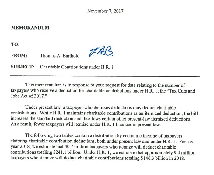 Those fears were reinforced by the JCT’s latest memo. The congressional tax scorekeeper estimates that, under current law, about 41 million donors will deduct charitable contributions of $241.1 billion next year. Under the GOP’s Tax Cuts and Jobs Act, the JCT estimates about 9.4 million donors would deduct charitable contributions of $146.3 billion.
